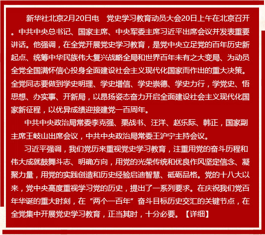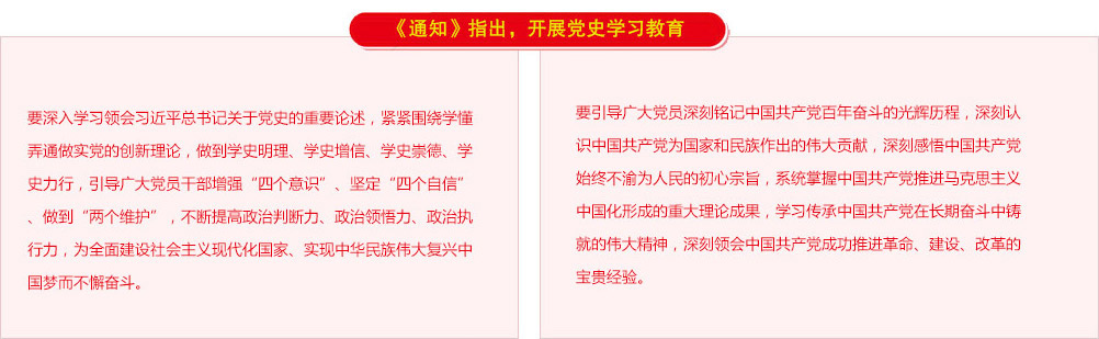 《通知》指出,2021年是中國共產黨成立100周年。為從黨的百年偉大奮斗歷程中汲取繼續前進的智慧和力量,深入學習貫徹習近平新時代中國特色社會主義思想,鞏固深化“不忘初心、牢記使命”主題教育成果,激勵全黨全國各族人民滿懷信心邁進全面建設社會主義現代化國家新征程,黨中央決定,在全黨開展黨史學習教育。【詳細】